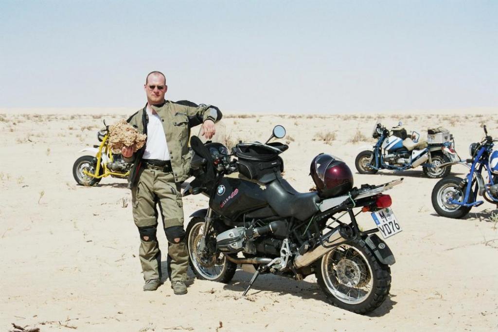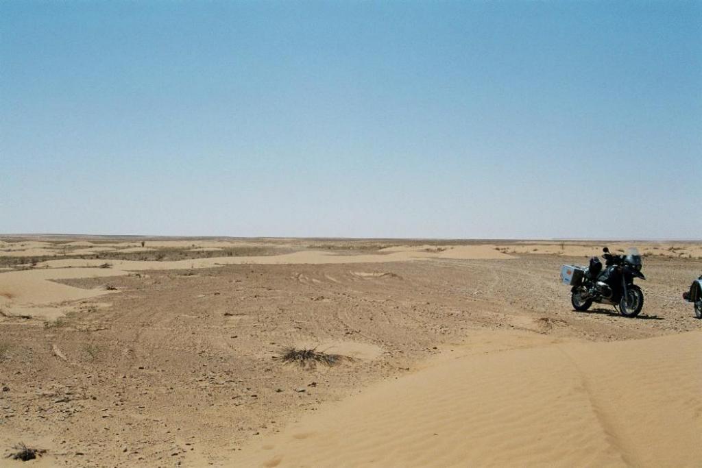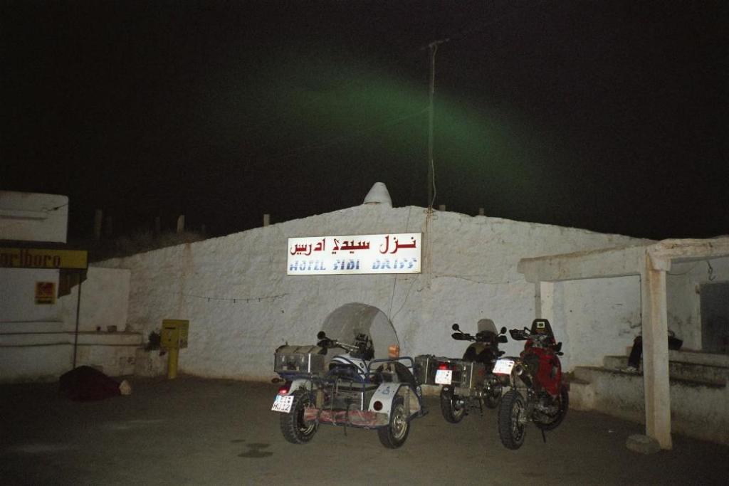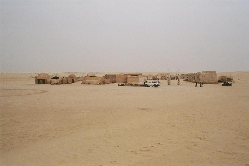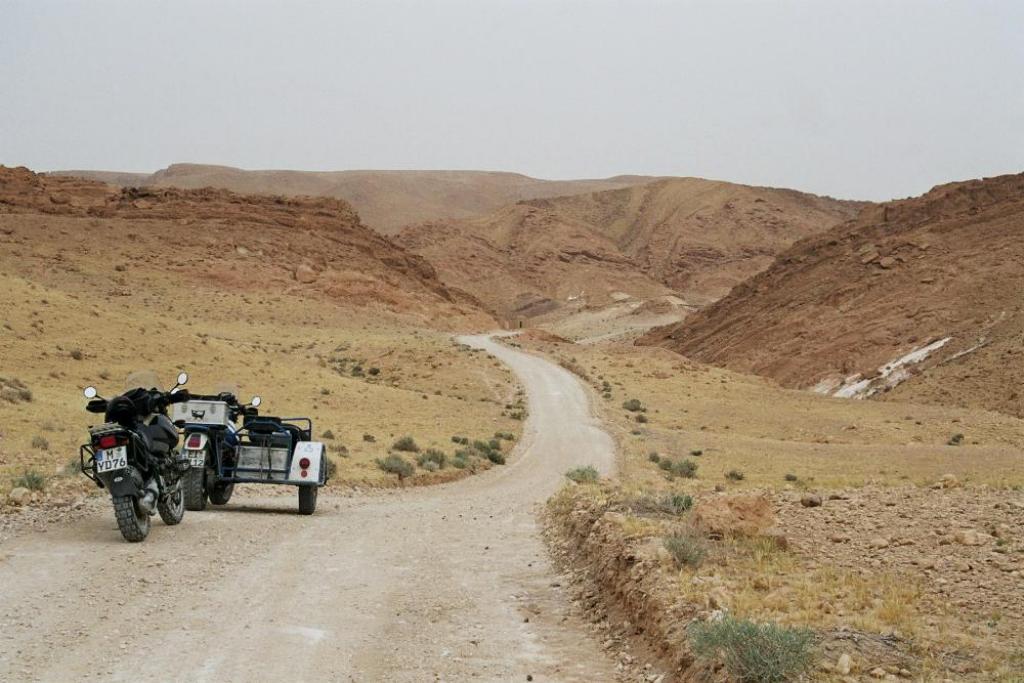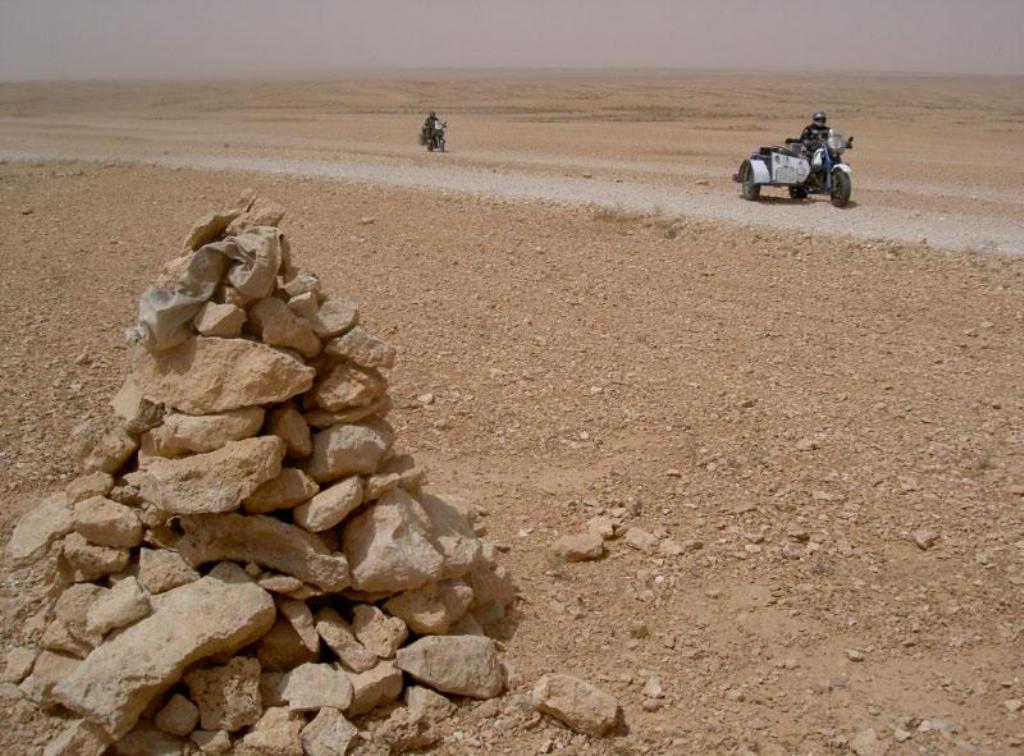 So läßt der erste, für uns äußerst tragische Zwischenfall auch nicht lange auf sich warten: Durch ein ständiges Geklapper in seiner Gespannsitzkiste genervt, hält Matthias an und stellt zu unserer beider Entsetzen fest, daß sich der Verschluß einer der zwei mitgeführten Bourbon-Flaschen geöffnet hat. Die Hälfte des Inhaltes schwimmt nun als muntere Pfütze in der Kiste rum, der Anblick dieses Verlustes treibt uns das pure Entsetzen ins Gesicht. In einem arabischen Land stellt eine Flasche Beam schon einen gewissen Reichtum dar, zumal wir uns jeden Abend einen kleinen Schluck gönnen oder mit Cola eine leckere Mischung zaubern. Nun ja, es hätte uns ja auch noch schlimmer treffen können. Die Schraubverschlüsse mit Klebeband gesichert, ging es dann weiter. Wir erreichen die Star-Wars-Kulissen und sind doch erstaunt, wie klein die Anlage eigentlich ist. In den Filmen und unseren Köpfen sah das alles viel größer aus. Also machen wir die typischen Tourifotos und suchen dann die Richtung für den Heimweg. Aufgrund der GPS-Daten auch hier kein Problem, nur das Wellblech macht wieder einmal arg zu schaffen.