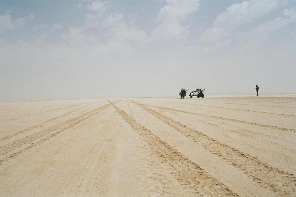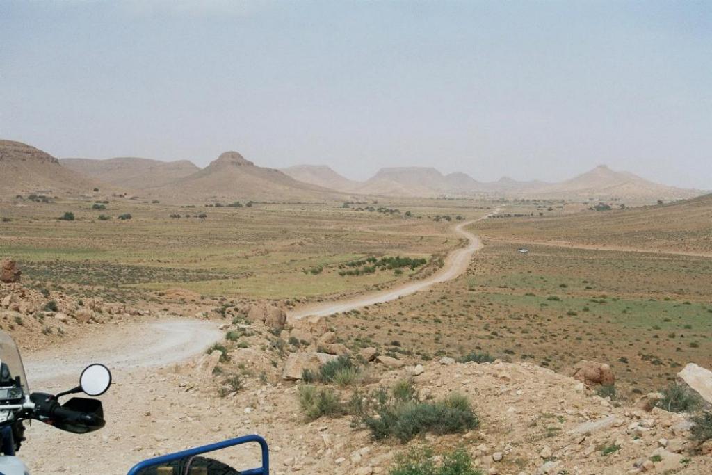 Der nächste Tag führt uns über den Chott El-Jerid nach Douz. Wir überqueren diesen ausgetrockneten Salzsee auf der westlichen Route (direkt hinter Nefta links). Diese Route war im letzten Jahr der kleinen Pannenserie zum Opfer gefallen und mußte unbedingt nachgeholt werden. Die Landschaft hat hier etwas vom Mond oder vielleicht doch eher etwas von Endzeitstimmung wie im Film "Mad Max". Die Oberfläche des See´s ist topfeben und mit etwas Übermut könnten wir hier glatt die Höchstgeschwindigkeiten der Maschinen messen. Aber wir geniessen lieber die "Aussicht" ins Nichts. So schauen wir ständig nach links und rechts und sehen stellenweise in alle Richtungen nur Horizont. Später wird die Piste dann steiniger, bevor wir die Straße südlich vom Chott erreichen. Und man möchte es kaum glauben, an diesem Tag fahren wir doch tatsächlich auch zehn Minuten im Regen.
