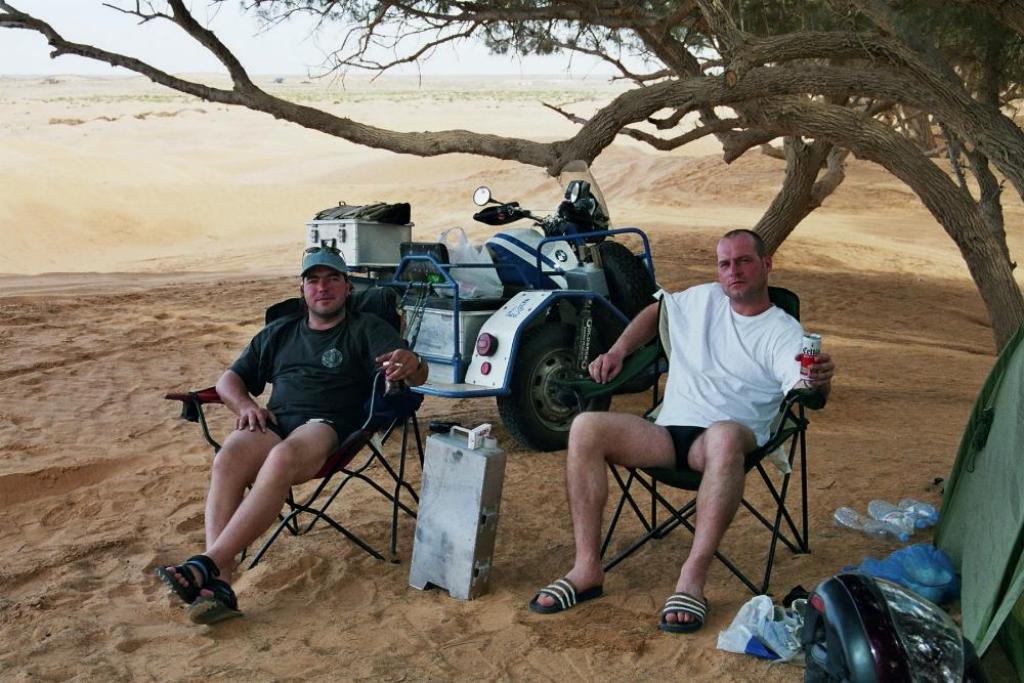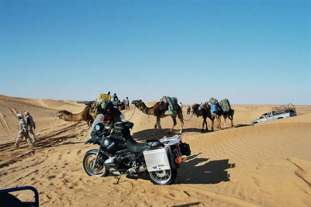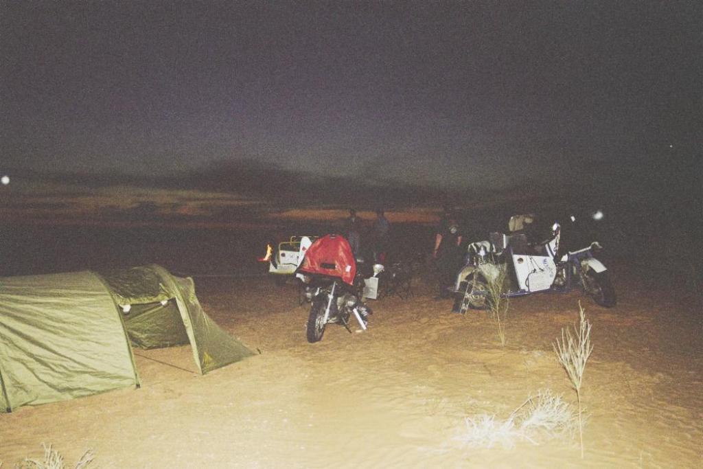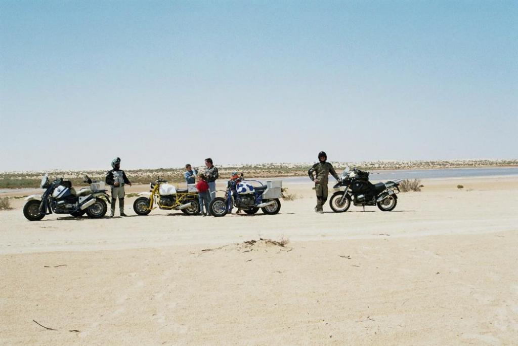 Tobi und Frank mit Ihren Kindern und Gespannen hatten sich uns angeschlossen. Eine gute Entscheidung, wie sich später herausstellte. So nahmen wir die Tour also in Angriff. Schon auf den ersten Metern bis zum Cafe Sahara, zeigte sich jedoch deutlich der Unterschied zwischen einer beladenen und einer unbeladenen Maschine. Noch am Vortag relativ sportlich und problemlos unterwegs, ging es für Yves jetzt schon an den starken Versandungen der Piste deutlich schlechter voran. Schon nach wenigen Kilometern rückte somit das Ziel in undendliche Entfernung. Am Cafe "Sahara" luden wir dann Yves´ Wasservorrat (immerhin zwölf Liter) und eine große Gepäckrolle auf den Beiwagen von Matthias´ Gespann. Und siehe da, um 25 Kilo erleichtert ging es gleich wieder viel besser. Allerdings verloren wir aufgrund eines kleinen Navigationsfehlers viel Zeit. Außerdem bedarf es schon dreier starker Männer, um ein eingesandetes Gespann wieder in die Spur zu bringen.