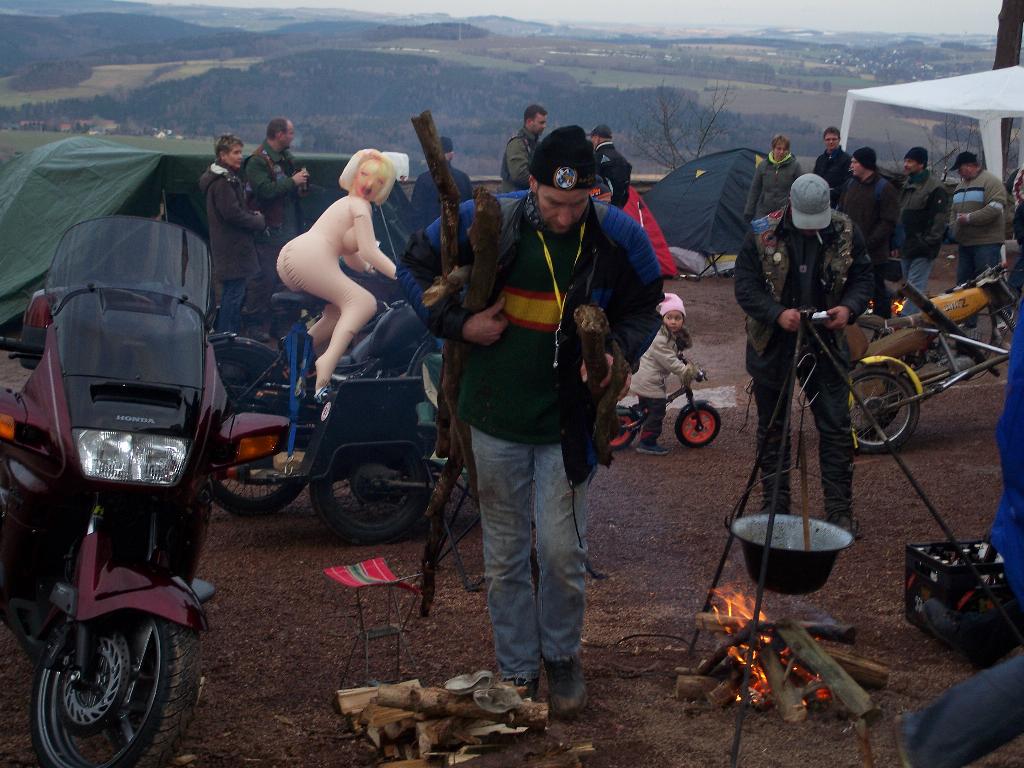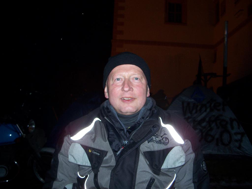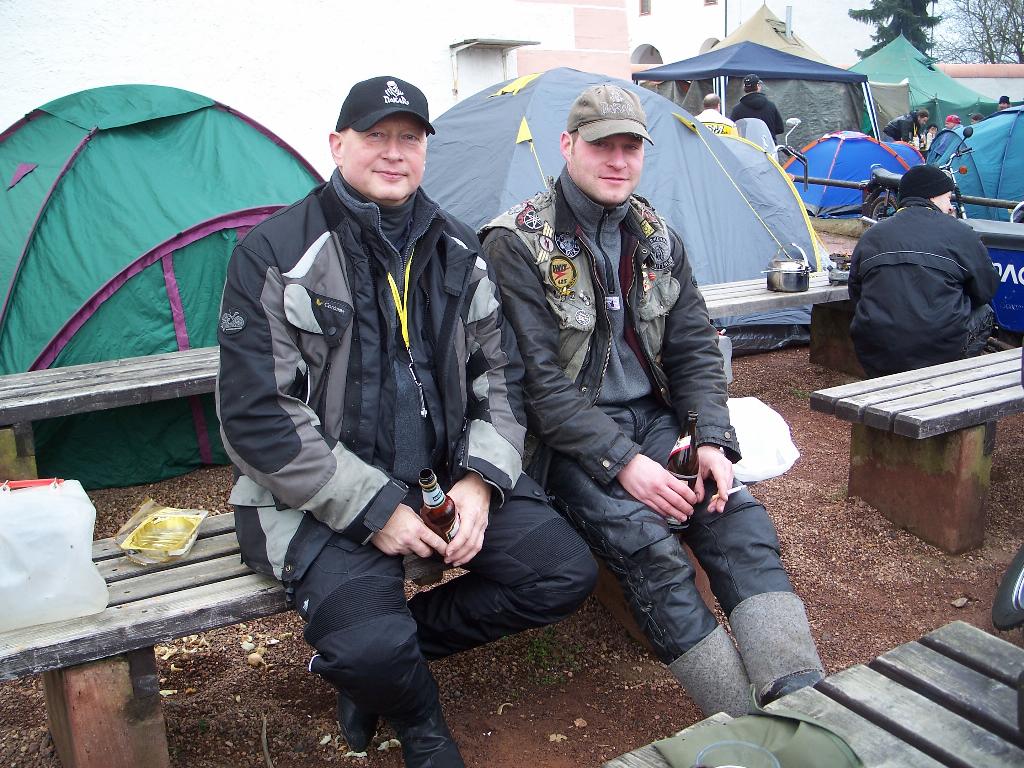 A-Burg 2008Na klar, wir waren auch in diesem Jahr wieder beim legendären Wintertreffen auf Schloß Augustusburg. Worauf freut man sich denn sonst das ganze Jahr?! ;-) Wie jedes Jahr fuhren wir auch heuer wieder donnerstags, da gibt es noch die guten Zeltplätze ;-) Nach einer problemlosen und schönen Fahrt erreichen Holger, Matthias und ich kurz vor 17.00 Uhr das Schloßgelände und finden unseren bevorzugten Platz vor. Frei für uns! Also fix aufgebaut, Zelt eingeräumt, umgehost, nen kurzen Soundcheck und ab gings ins Wochenende! Wir treffen jede Menge Bekannte und Freunde und fühlen uns am Lagerfeuer der Zeltnachbarn pudelwohl. Freitag fahren wir drei ins Holz. Schließlich erwarten wir noch weitere Freunde, und denen kann man freilich kein Nachbarfeuer anbieten. Und da wir mit drei Gespannen unterwegs sind, haben wir reichlich Platz für reichlich Holz. Das sollte langen! Freitag Abend kredenzt uns Holger so eine Art Pichelsteiner Eintopf. Nur bissl anders, sagt er... Das Zeug war dermaßen lecker, herrlich. Und es bestätigt sich wieder einmal: Ne Suppe, is ne Suppe! Die Lebensgeister kehren augenblicklich in die etwas verfrorenen Körper zurück und sofort steigt die Stimmung. Just in dem Moment hält vor uns eine blaue ETZ250 mit einem sichtlich stark unterkühltem Fahrer drauf. Erst erkennen wir ihn nicht, bis er sich mit Handschlag bei uns als "Toni" zu erkennen gibt. Toni, Toni, Toni...verdammt, woher kennen wir den Bengel nur??? Na klar! Krumbach im letzten Sommer! Damals wurden wir miteinander bekannt, und ich glaube wir dürfen behaupten, den Toni zum Motorradfahrer bekehrt zu haben. Damals wußte er es noch nicht so richtig...Aber gut, das ist eine eigene Geschichte... Toni ist so durchgefroren und am Zittern, daß er den gereichten Pichelsteiner mehr verschüttet als ißt. Aber auch er bekommt sofort wieder Farbe ins Gesicht und nen stabileren Kreislauf und alles ist wieder gut. Auch Herbert kommt Freitag Abend noch angebraust, der wollte eigentlich erst Samstag kommen. Aber um so besser, gibt es noch mehr Spaß und Unterhaltung! Samstag Morgen, viel zu früh für uns, kommt Hendrijk, mein Vater, auch zur Augustusburg. Bis wir uns jedoch ne Stunde später aus dem Zelt geperlt haben, dreht Vater eine große Fotorunde über den gut besuchten Schloßhof. Davon zeugen die unten zu sehenden Bilder... Die Heimfahrt am Sonntag beginnt bei schönstem Winterwetter. Erst ab Regensburg wird die Nebelsuppe so dick, daß man oft weniger als 50 Meter Sicht hat. Wir freuen uns wie immer aufs nächste Jahr. Wenn es wieder heißt: auf zum Schloß Augustusburg! Aber nun genug gelesen. Unten ein paar, meist unkommentierte Bilder vom diesjährigen, wieder einmal sehr schönen Treffen... |